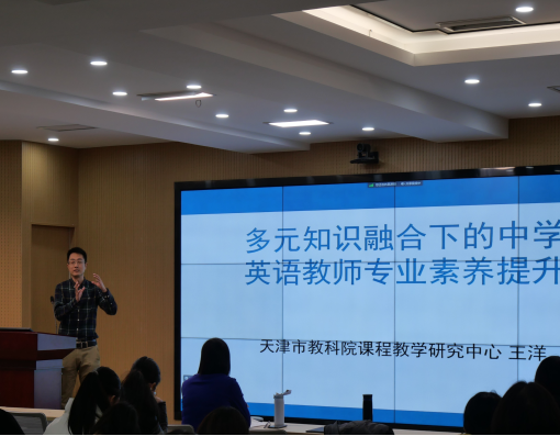 王洋教研员以“多元知识融合下的中学英语教师专业素养提升”为题,围绕认识备课、外语教师专业能力和发展途径、外语语言能力、外语教学能力等四个方面展开分享,强调外语教师专业能力的构成部分是多维的,包括人际关系能力、员工管理能力,学科专业能力、科研能力等。王洋指出,教师专业发展是一个长期的、逐渐的、变化的过程,语言基本功对一名合格的英语教师十分重要,他鼓励同学们持之以恒,积累必备的学科知识和课堂管理知识。