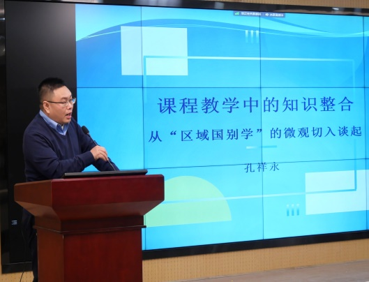 永利集团304am登录孔祥永副教授围绕“课程教学中的知识整合——从‘区域国别学’的微观切入谈起”发言,以教学中的语言实例为切入口,呈现如何在英语课程教学中帮助员工进行知识整合。英语师范专业陈柯延、朝鲜语专业王梓,分别就学习中开展知识整合活动的方法和体会进行交流汇报。