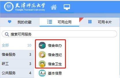 由304永利集团官网入口“网上服务大厅”(http://ehall.tjnu.edu.cn/new/index.html),点击“员工办事”,在“账户登录”位置输入学号、密码,点击登录,在页面左侧“可用应用”中查看宿舍申办、宿舍违纪、宿舍卫生等应用。